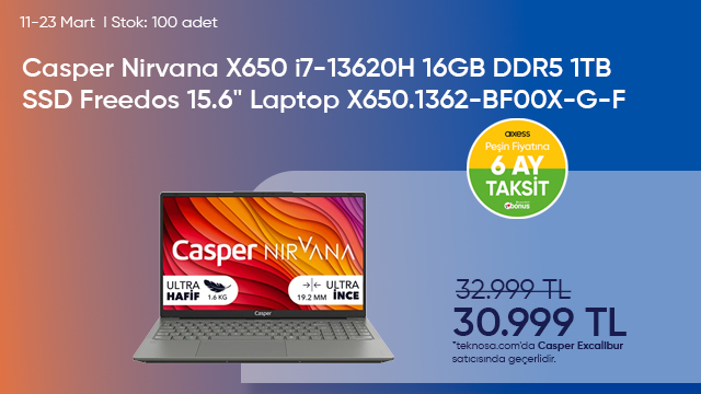 Sayfamız üzerinde göreceğiniz Casper i7, i5 ya da i3 işlemcili laptop ve notebook modellerinden ihtiyacınız olanı birkaç tıkla kolayca satın almanız mümkün. İşlemci alternatiflerinin yanı sıra buradaki Casper laptop modelleri ekran boyutları ile de çeşitleniyor. 15.5 veya 14 inç ekran büyüklüğüne sahip çeşit çeşit cihaz bu sayfada karşınızda. Üstelik Teknosa'nın her cebe uygun Casper laptop fiyatlarından faydalanarak alışverişinizden kazançlı çıkabilirsiniz. Diğer yandan Casper etiketli notebook ve laptop modelleri farklı amaçlar için tasarlanmış. Örneğin, gün içinde kısa zamanda çok iş halletmek durumunda kalıyor ve bu performansı sağlayacak bir laptop modeli arıyorsanız, Casper Nirvana X500 tam size göre. Zira iş verimliliğini artıracak pek çok özellik bu bilgisayarda mevcut. Profesyonel performans için tasarlanan Nirvana X500'ün yanı sıra, Casper Nirvana X400 notebook modelini de burada bulmak mümkün. Hem son derece hafif hem de şık tasarımıyla dikkat çeken bu cihazı çantanızda rahatlıkla taşıyarak gittiğiniz her yere götürmenin özgürlüğünü yaşayın! Tüm bunlara ek olarak Casper Nirvana S500 ve Casper Nirvana C350 notebook modellerinden birini de Teknosa kolaylığıyla anında satın almanız mümkün. Siz de ihtiyacınız olan Casper laptop ve notebook bilgisayar modeline karar verip alışverişinizi tamamlayın, ürünler kısa sürede adresinize gelsin!