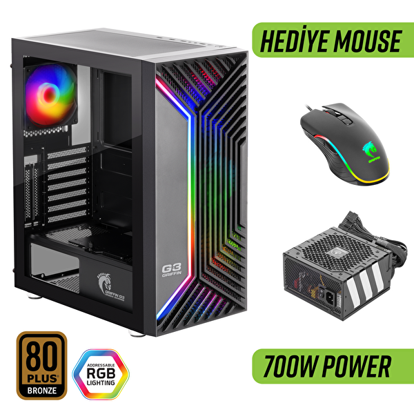 Green Griffin G3 Plus ARGB Gaming Bilgisayar Kasası (4×120mm Fan + Tempered Cam) – 700W 80+ Bronze PSU Dahil
