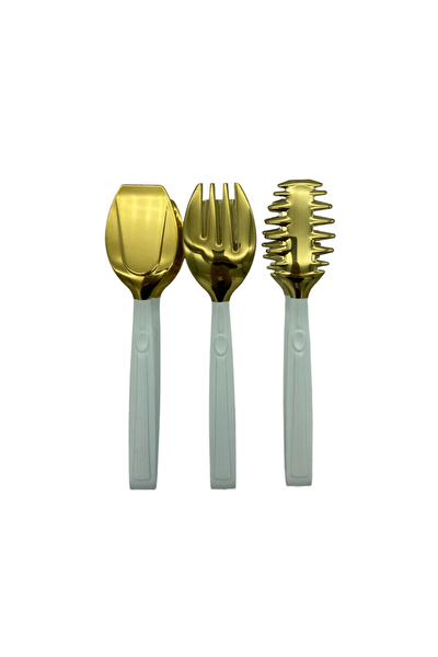Kitchen Design Lab Lüks 3 Parça Beyaz Gold Paslanmaz Çelik Servis Sunum Makarna Salata Pasta Maşa Seti
