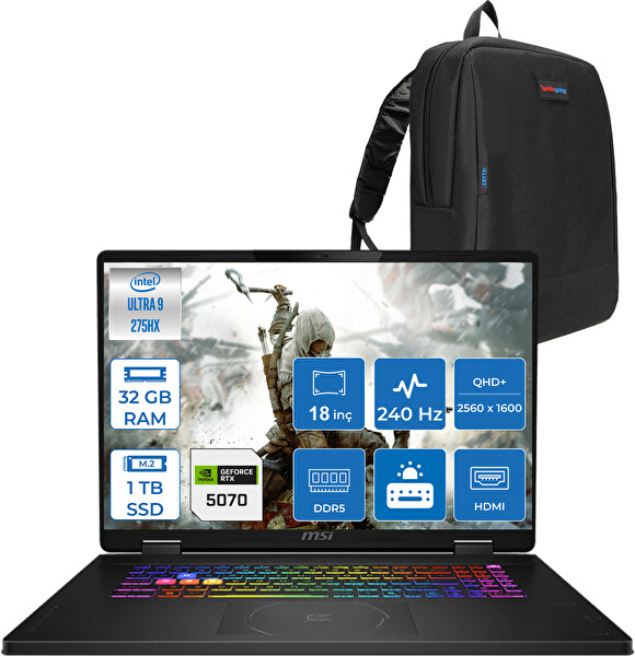 MSI Crosshair 18 Hx A2XWGKG-032XTR Ultra 9-275HX 32 GB RAM 1 TB SSD 8GB RTX5070 18"Wqxga FreeDOS W032XTRF11-Zetta Çanta